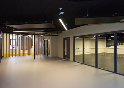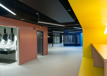 Set over three storeys the facility provides vibrant skills demonstration spaces, breakout areas to encourage student interaction and socialising with booth seating and study pods, production labs and studios, co-working space and recording studios known as ‘sanctums’ to enhance creativity, and all with a firm focus on ensuring comfort for the campuses 300 students. Whilst wholly specialist and bespoke, the spaces are designed with flexibility in mind to ensure the facilities are adaptable to changing educational needs to ensure the investment made here will have long-lasting benefits for all. The contemporary design includes a welcoming foyer area with reception desk and eye-catching staircase to the first floor.
